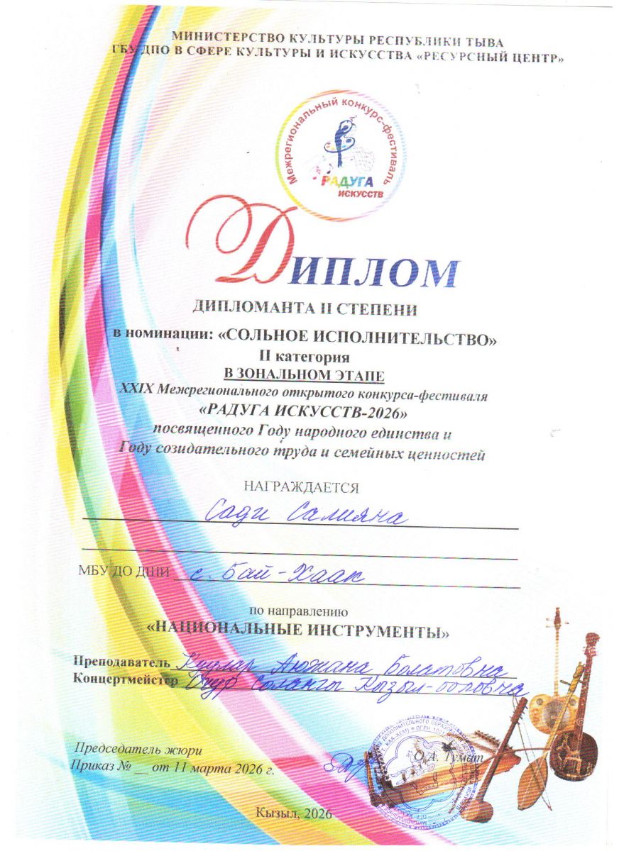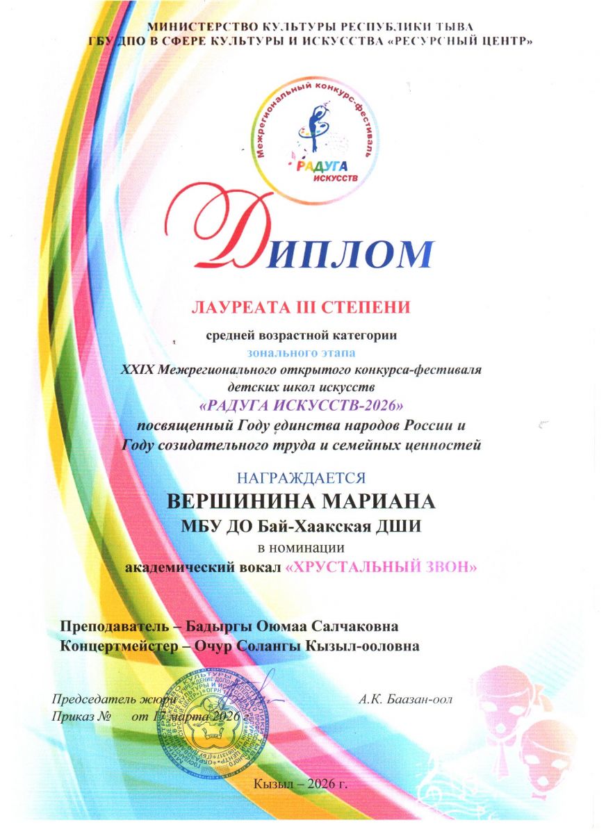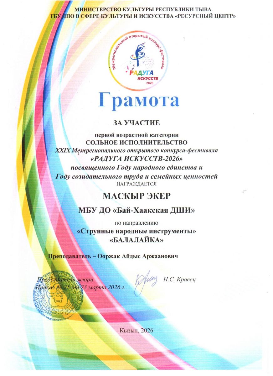 XXIX Межрегиональный открытый конкурс-фестиваль "Радуга искусств-2026" учащихся детских школ искусств, посвященного Году единства народов России и Году созидательного труда и семейных ценностей в Республике Тыва стартует в Кызыле 19 марта 2026 года. Мероприятия пройдут весной 2026 года и соберут сотни талантливых участников РЕспублики Тыва и Хакасии.